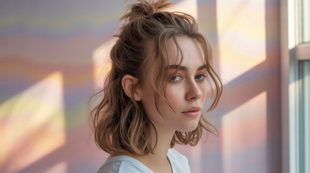 The half-up twisted crown is a playful and charming option among casual hairstyles that always look effortlessly cute. By twisting small sections of hair from each side and securing them at the back, this style creates a subtle crown effect while keeping the rest of the hair flowing freely. It works beautifully for medium to long hair and complements straight, wavy, or lightly curly textures. Using lightweight texturizing spray or styling cream helps keep the twists in place while maintaining natural, airy volume.
