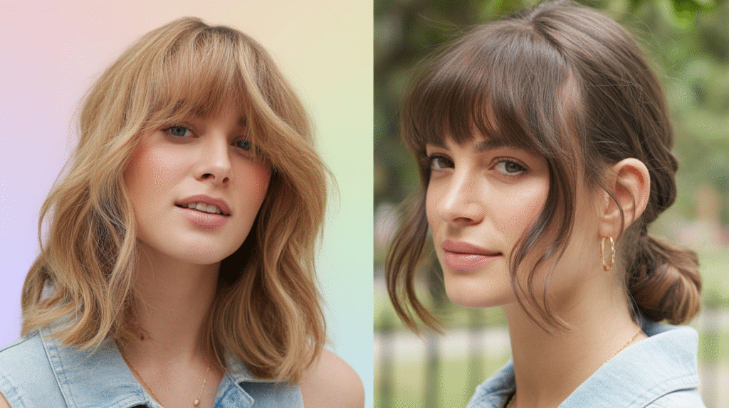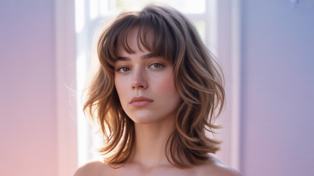 Soft curtain bangs with natural layers are perfect for casual brunches, office days, or everyday outings. The style proves how casual hairstyles can elevate a simple look, balancing effortless charm with practical, low-maintenance styling.