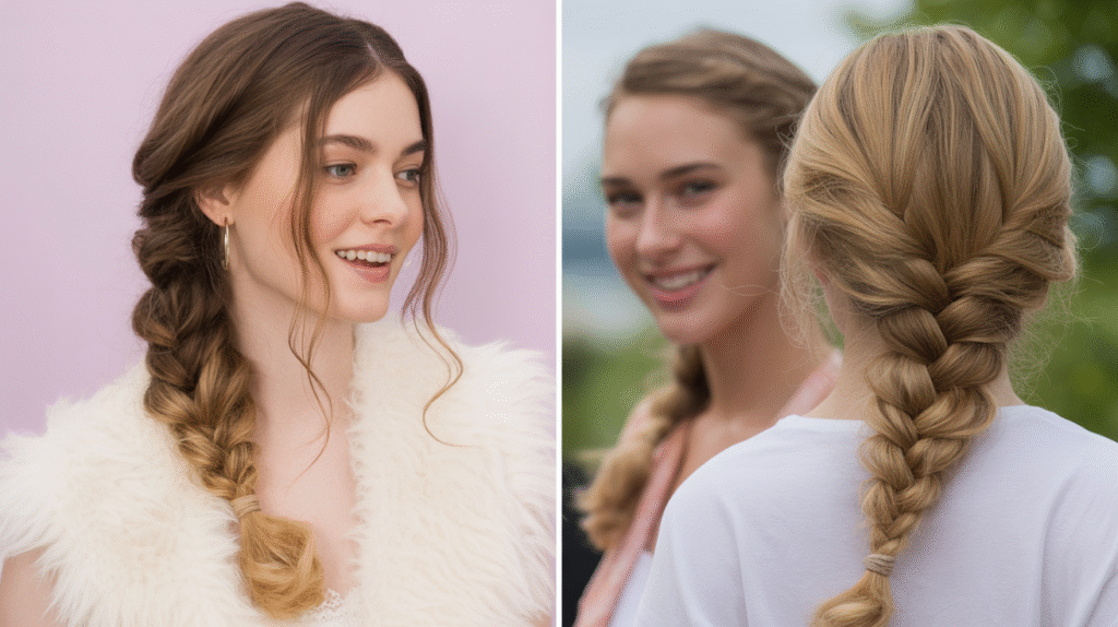 This hairstyle is versatile for casual outings, coffee dates, or relaxed social events. The loose side fishtail braid demonstrates how casual hairstyles can be playful, chic, and practical at the same time, making it a go-to everyday look.