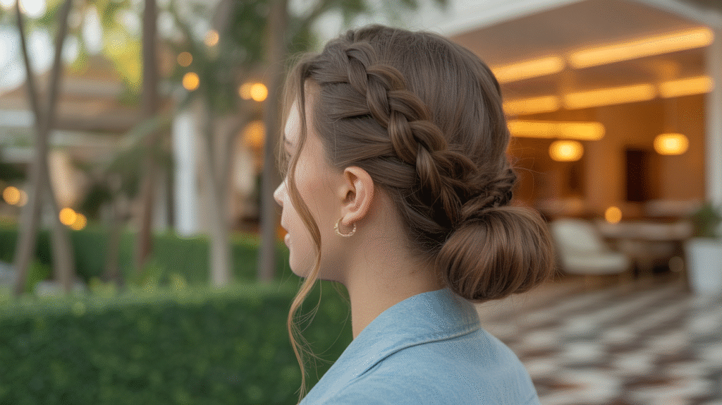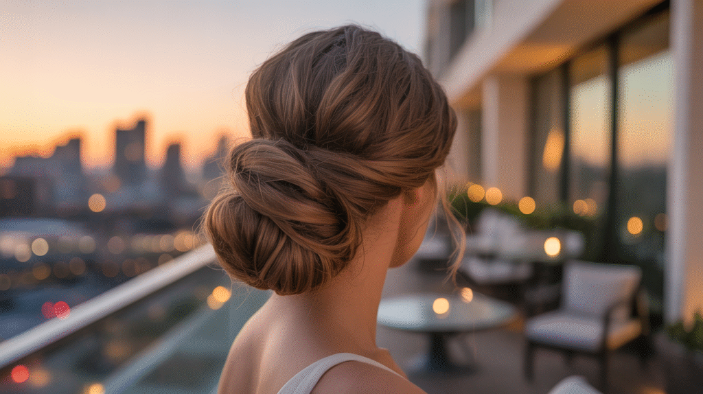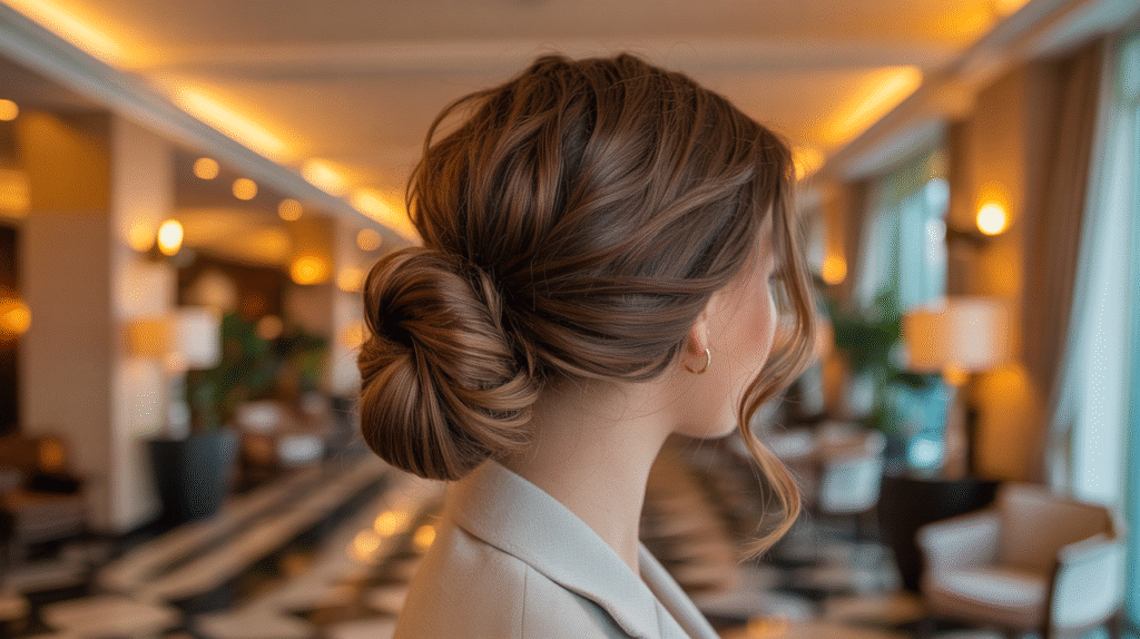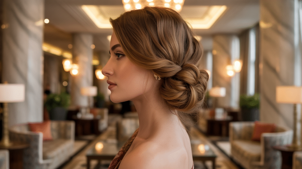 This hairstyle is both practical and stylish. The side placement makes it asymmetrical and modern, while the twists add texture and detail. You can keep it sleek for a refined look or slightly loosen strands around the face for a romantic, effortless vibe. Accessories like delicate pins, small flowers, or minimalist clips can enhance the bun’s elegance, making it suitable for a variety of occasions.