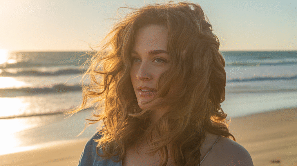 This hairstyle works for any casual outing, from coffee runs to weekend strolls, and even transitions seamlessly into evening events. Thick hair gives each wave body and texture, making the style look fuller and more dynamic. For extra shine and smoothness, finish with a light-hold hairspray or shine mist. Beachy waves are also incredibly versatile—you can part your hair in the center for a relaxed vibe or slightly to the side for a more romantic appearance.