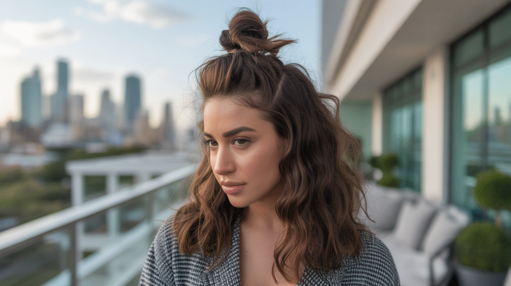 Messy top knots are incredibly versatile—you can make them neat for a polished vibe or loose and tousled for a more relaxed, playful look. The style also works well with hair accessories such as scrunchies, pins, or headbands to add personality and flair. Thick hair holds the bun’s shape all day, so you don’t have to worry about it unraveling or looking flat. This is a practical yet trendy option for women who want style without sacrificing comfort.