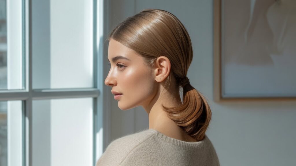 The low ponytail is the ultimate quick-and-easy hairstyle that never goes out of style. It’s sleek, simple, and perfect for any occasion — from morning meetings to casual brunches. Just brush your hair smooth, gather it at the nape of your neck, and secure it with a simple elastic.