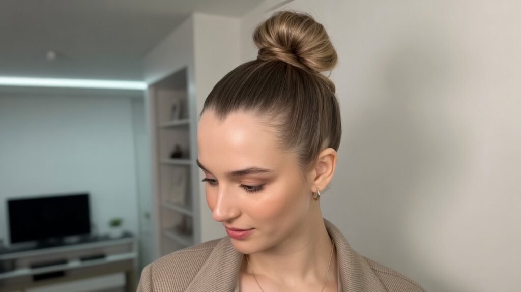 Styling Tip: Use a little styling cream or hair oil to smooth out any flyaways and enhance the bun’s sleek finish.