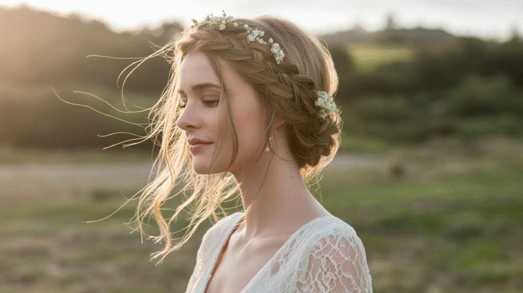 The boho braided crown is the dream hairstyle for brides who want to embrace their inner free spirit while still keeping things effortlessly elegant. This look weaves natural texture, soft braids, and a touch of whimsy into one stunning creation. It’s ideal for outdoor weddings — think garden, woodland, or beach settings — where the soft breeze and sunlight bring the look to life.