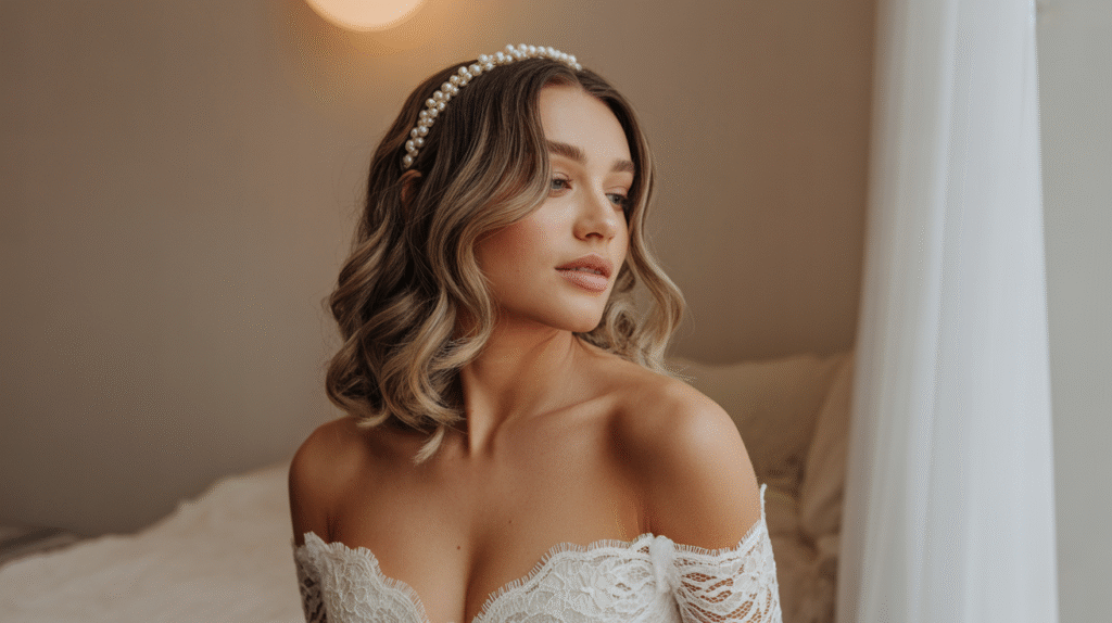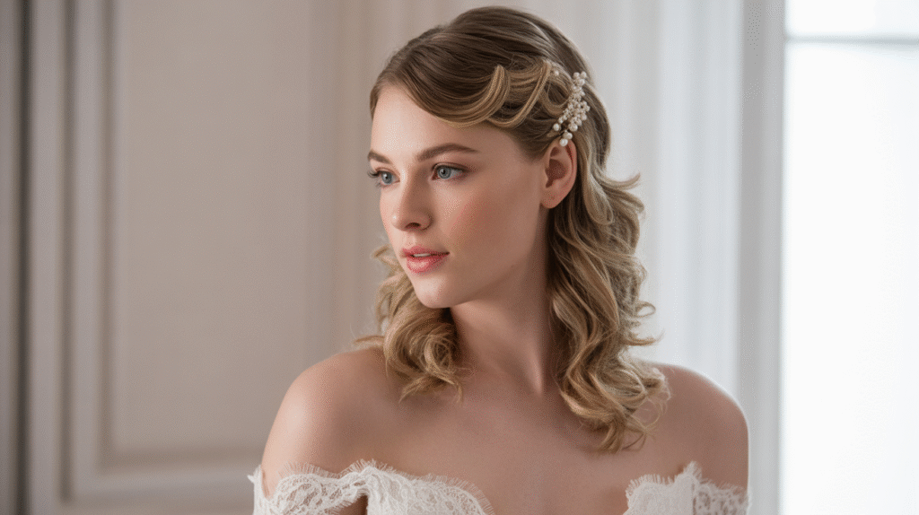 This style pairs perfectly with almost any wedding aesthetic — from bohemian garden ceremonies to classic ballroom receptions. If your gown has intricate detailing, romantic waves balance the look without overwhelming it. You can elevate the vibe with a delicate hair vine, pearl headband, or subtle floral clips for that enchanting final touch.