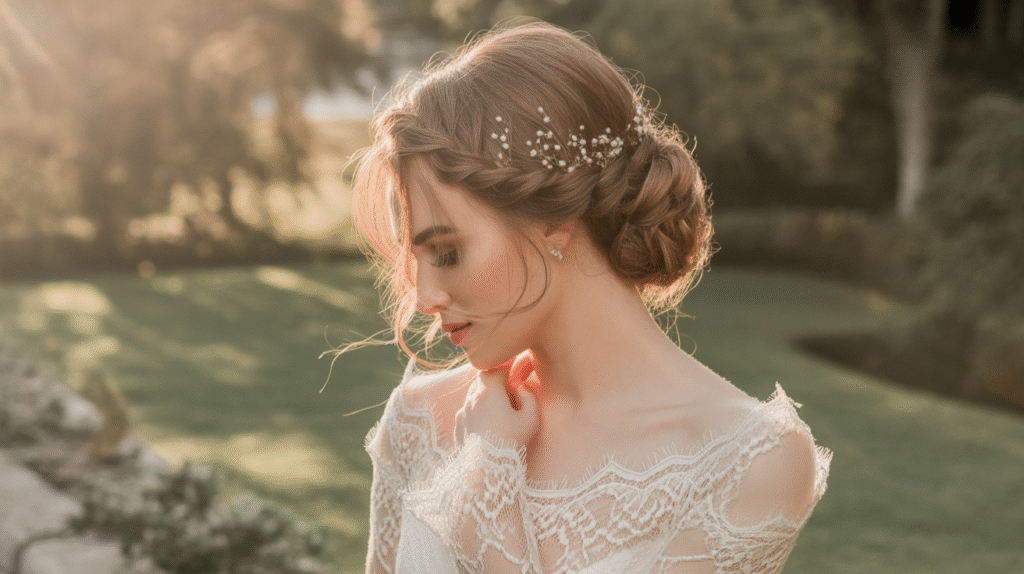 It’s ideal for outdoor or rustic weddings — think vineyard or countryside settings — where the soft braids catch the light beautifully. This look also pairs perfectly with lace gowns, veils, or dainty floral accessories. The low braided bun transitions flawlessly from the ceremony to the dance floor — still elegant, still effortless.