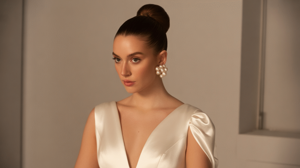 This style pairs effortlessly with structured gowns, halter necklines, or backless dresses. It also allows your accessories — like statement earrings or a dramatic veil — to truly shine. The polished high bun is elegance redefined: it’s simple, but it makes a statement without even trying.