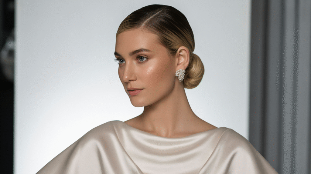 The sleek chignon is for the bride who loves clean lines, understated glamour, and timeless sophistication. This style embodies the “less is more” philosophy — neat, polished, and perfectly balanced. Worn low at the nape of the neck, the chignon frames the face beautifully while highlighting your neckline and shoulders. It’s the perfect match for modern minimalist gowns, structured silhouettes, and contemporary bridal looks.
