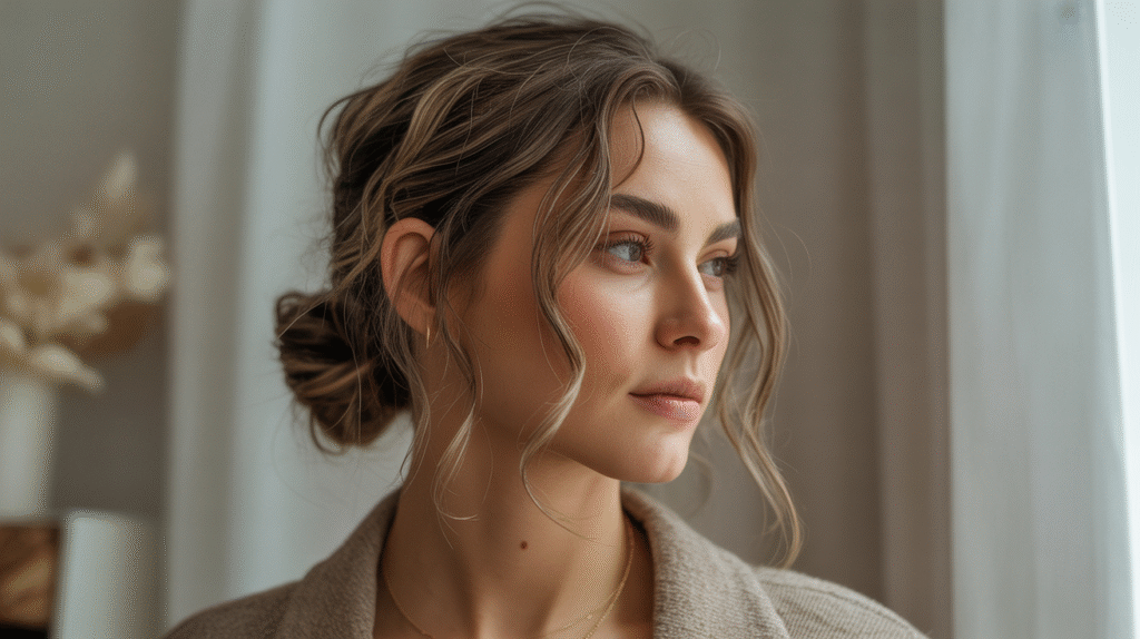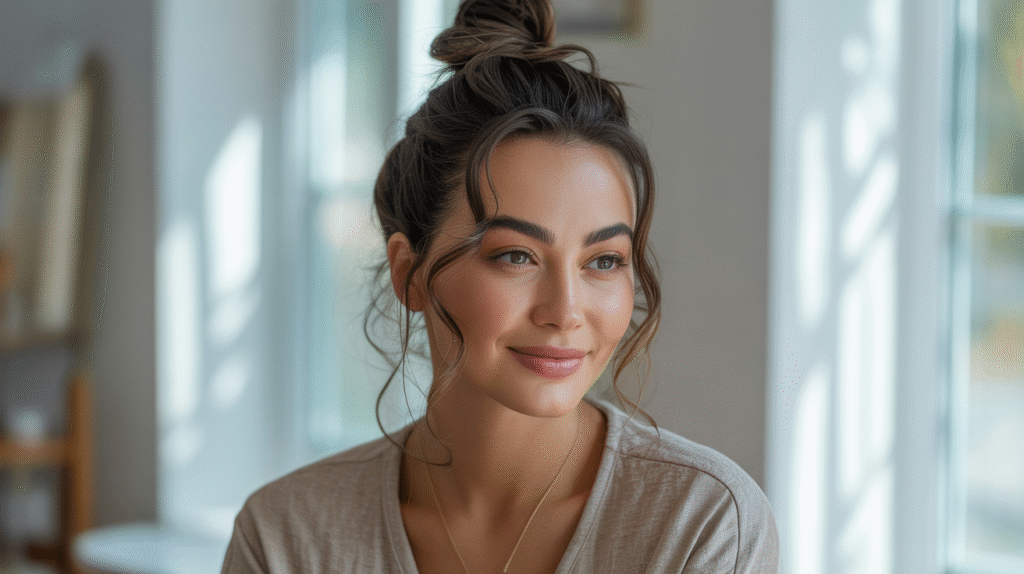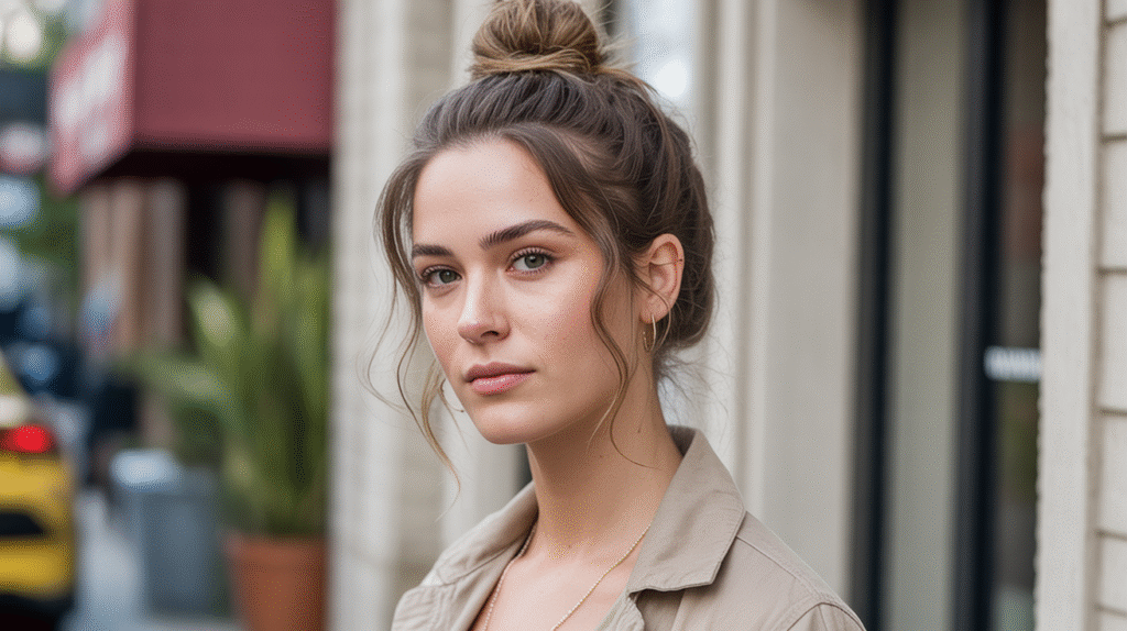 What makes the top knot so effective for looking instantly polished is the combination of height and softness. Leaving a few tendrils around the face softens the look, while a slightly teased crown adds dimension. Optional accessories like a subtle scrunchie, hair scarf, or minimalist clip can elevate the style further, making it versatile for both casual and slightly dressier everyday occasions.