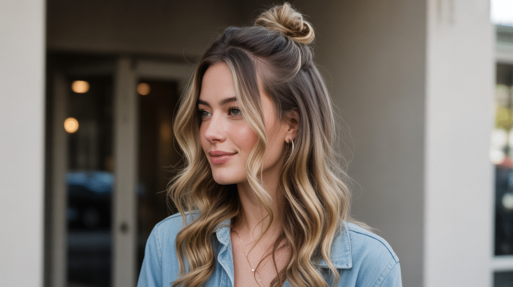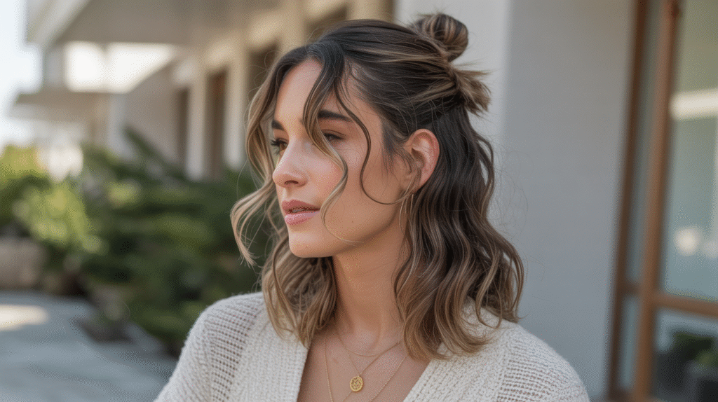 Ideal for work, errands, or casual outings, the half-up knot gives the impression of intentional styling without taking much time. Soft, face-framing strands and natural texture make it approachable and relaxed, while small accessories like a ribbon, clip, or hair tie can personalize the style and add a touch of charm.