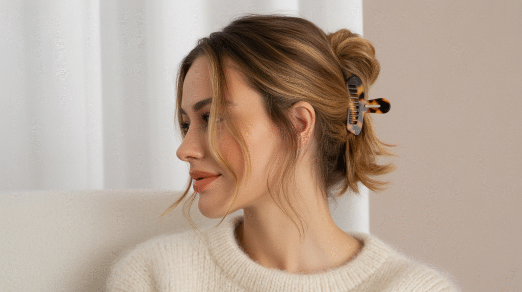 This look is the blueprint for “cute but casual.” The half-up mini claw clip twist pulls your hair back just enough to open up your face, but still keeps that soft, laid-back energy. It’s perfect for days when your hair has natural texture going on — waves, slight frizz, second-day bend — because the style actually looks better with a bit of movement.