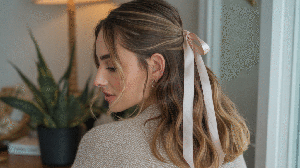 What makes this hairstyle so reliable is how versatile it is. Straight hair, waves, curls, or second-day texture — the half-up ribbon tie works with all of it. The lifted top section gives your face a more awake, put-together look, and the ribbon gives that subtle “I actually tried” energy even when you didn’t. It’s perfect for school, work, brunch, or anything in between.