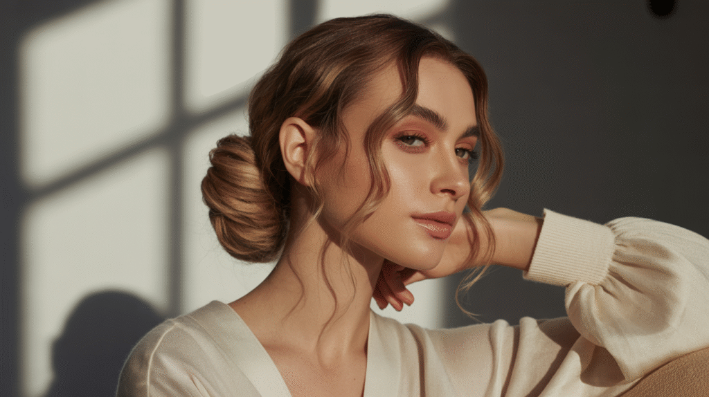 The loose low bun is that girl — relaxed, soft, and effortlessly polished. It’s the perfect style for the days when your hair feels uncooperative but you still want to look like you tried. By gathering everything at the nape and leaving a little natural texture in the bun, you get a look that’s both intentional and laid-back. It’s giving “quiet luxury,” but in a casual, everyday way.