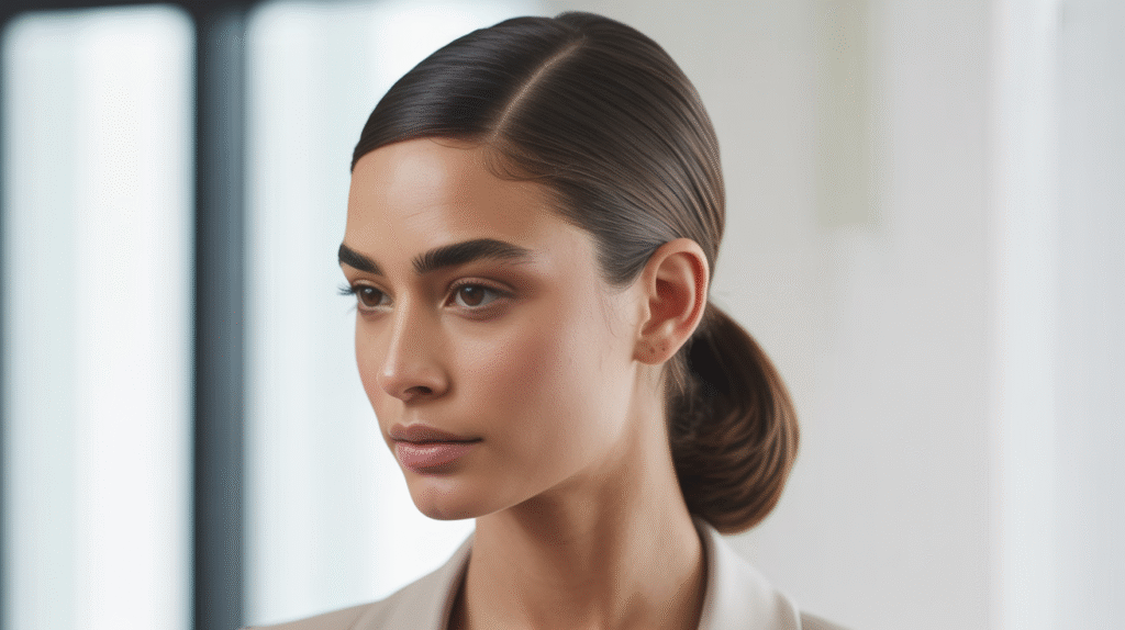 A sleek low ponytail is one of those hairstyles that just never misses. It’s simple, classy, and instantly makes you look like you have your life together — even on days when you absolutely don’t. This style smooths out the top, keeps everything clean, and gives off that “effortless cool-girl” energy. Whether you’re wearing loungewear or a crisp blouse, it pairs with literally anything.