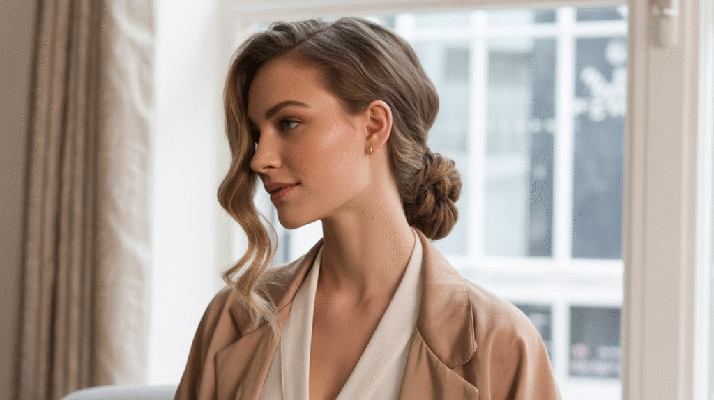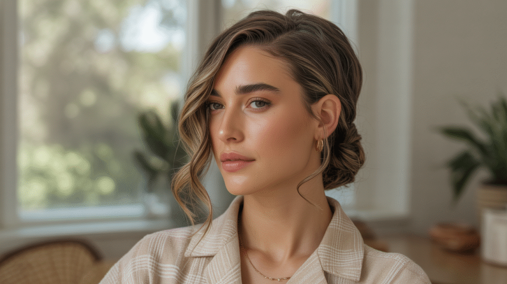 The twisted side sweep is a simple way to elevate everyday hair with minimal effort. By twisting sections from one side and pinning them back, you instantly create a hairstyle that feels polished yet relaxed. It’s perfect for medium to long hair and works beautifully with natural texture, slight waves, or straight strands, giving a soft frame around the face while keeping the hair controlled.