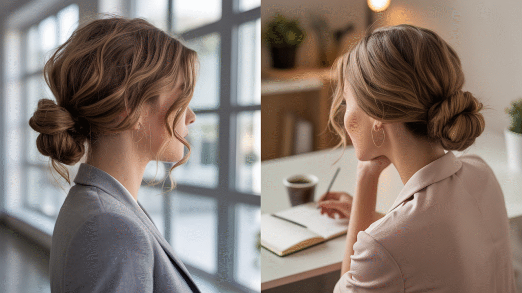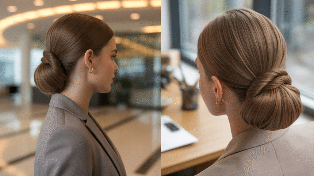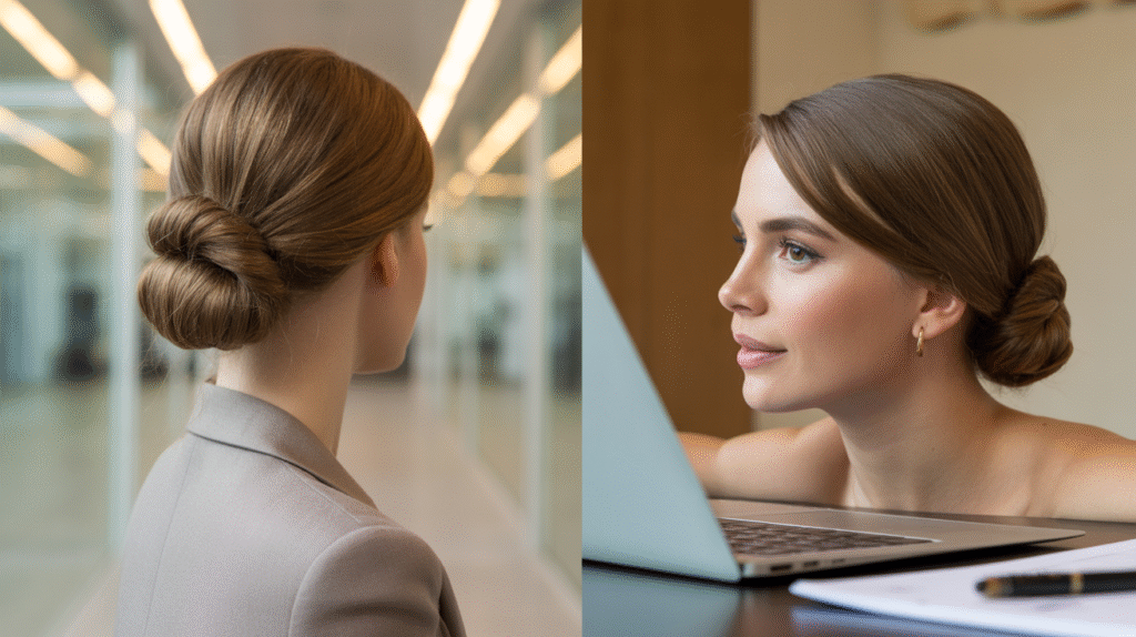 What makes the low twisted bun a favorite among professional hairstyles for women is its versatility. You can make it sleek and tight for a corporate setting or slightly loose for a softer, more approachable look. It pairs perfectly with blazers, shirts, or minimalist office dresses, giving a refined, put-together impression. Quick hairstyles for office mornings like this one require minimal effort while maintaining a neat, stylish look throughout the day.