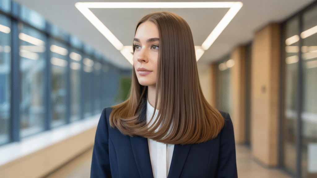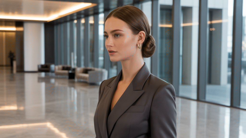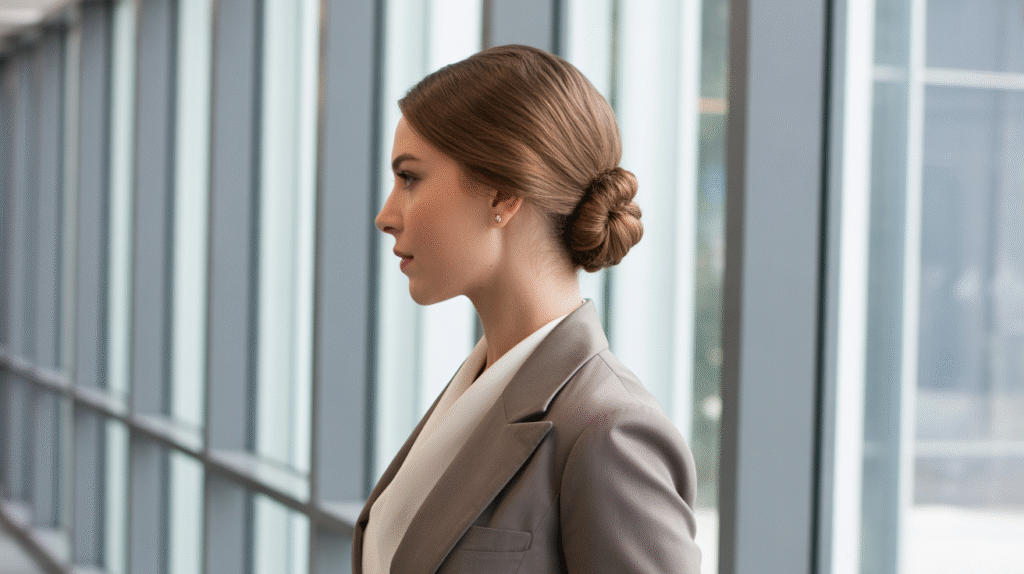 What makes the sleek side part so popular among professional hairstyles for women is its simplicity and versatility. You can wear it straight for formal meetings or pair it with light accessories for a slightly softer, creative office vibe. Quick hairstyles for office mornings like this one are ideal because they take minimal time to achieve while ensuring your hair looks glossy, smooth, and office-appropriate all day long.