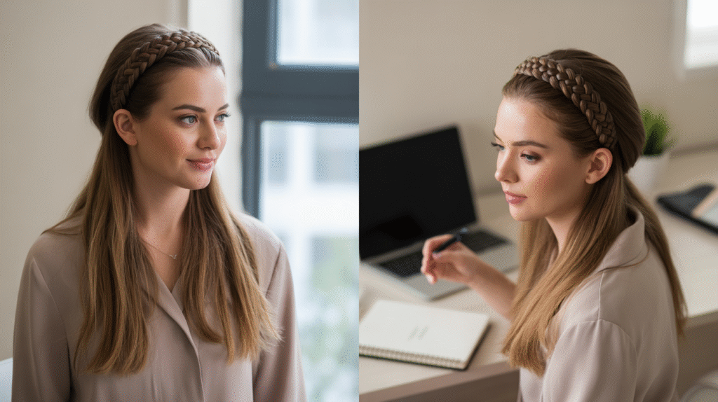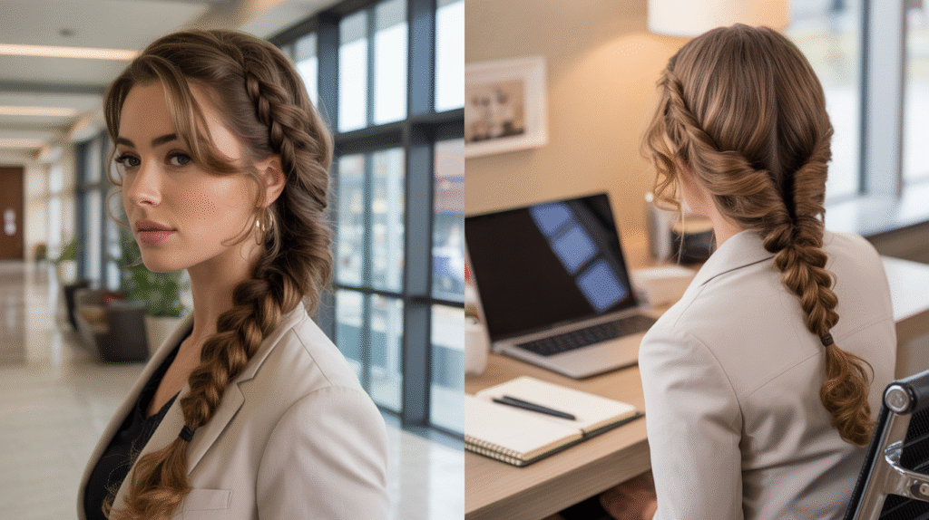 What makes this hairstyle a favorite among professional hairstyles for women is its adaptability. You can braid a small section along the hairline as a “headband” or create a slightly thicker braid for a more defined statement. The rest of your hair can be left loose, straight, or lightly curled for softness. Quick hairstyles for office mornings like this one save time while keeping you looking organized, polished, and stylish.
