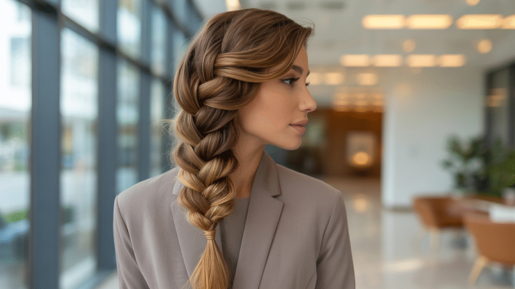 This hairstyle works for a variety of office environments — from formal corporate settings to more casual or creative workplaces. The braid can be tight for a sleek, structured style or slightly loose for a softer, approachable look. Quick hairstyles for office mornings like this one are ideal because they combine practicality with elegance, ensuring your hair remains polished throughout a busy day without requiring constant touch-ups. This braid also pairs beautifully with professional outfits, blazers, or minimalist dresses, making it a go-to style for polished, work-ready looks.