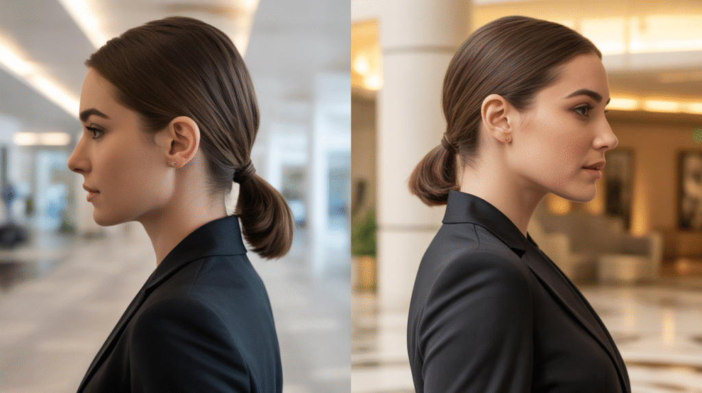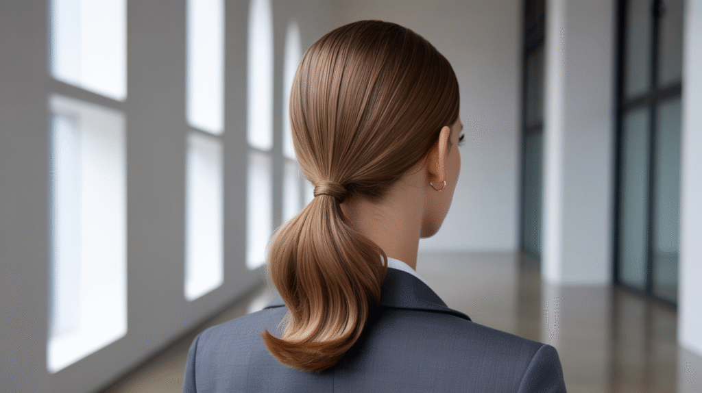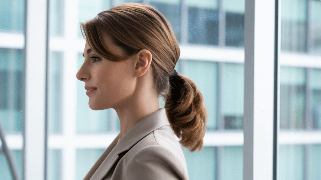 What makes this style such a go-to is how versatile it truly is. You can keep it ultra-sleek for a sophisticated corporate vibe or soften it slightly with a natural finish for a more relaxed workday. Quick hairstyles for office life should be reliable, and the low ponytail delivers — staying intact through long work hours, commutes, and busy schedules. It frames the face gently, keeps hair off the collar, and always looks tidy, making it a top choice in professional hairstyles for women who need both convenience and confidence in their daily routine.