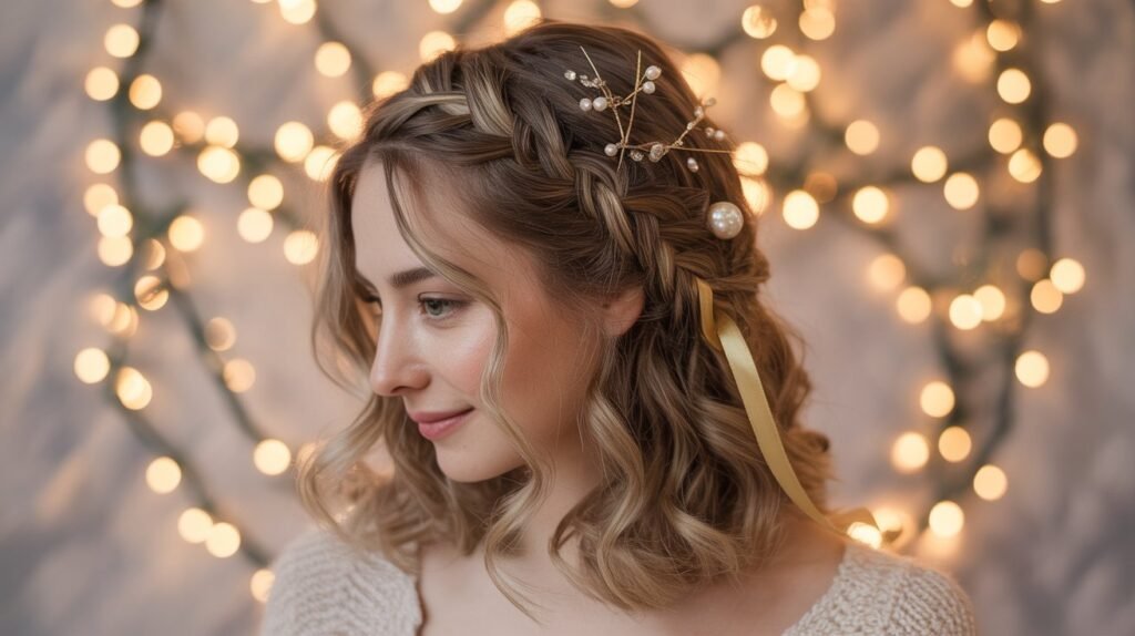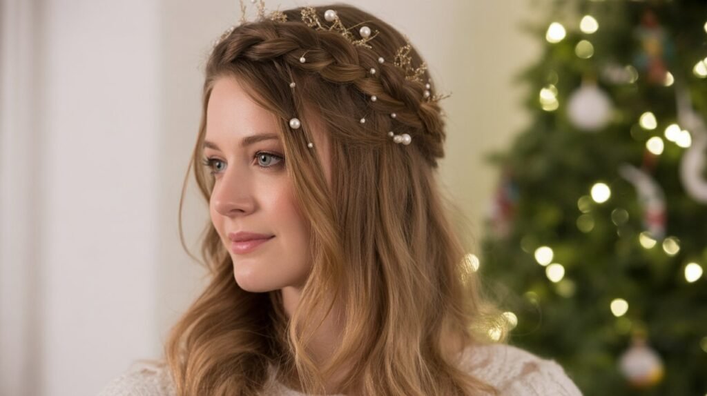 6- Halo Braid with Sparkly Accessories – Elegant & Festive