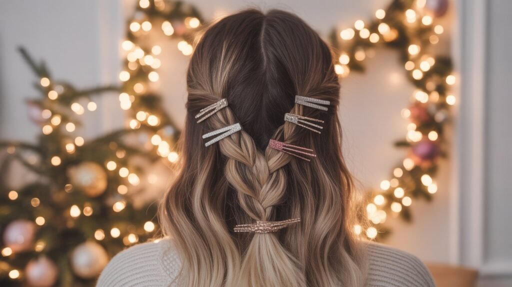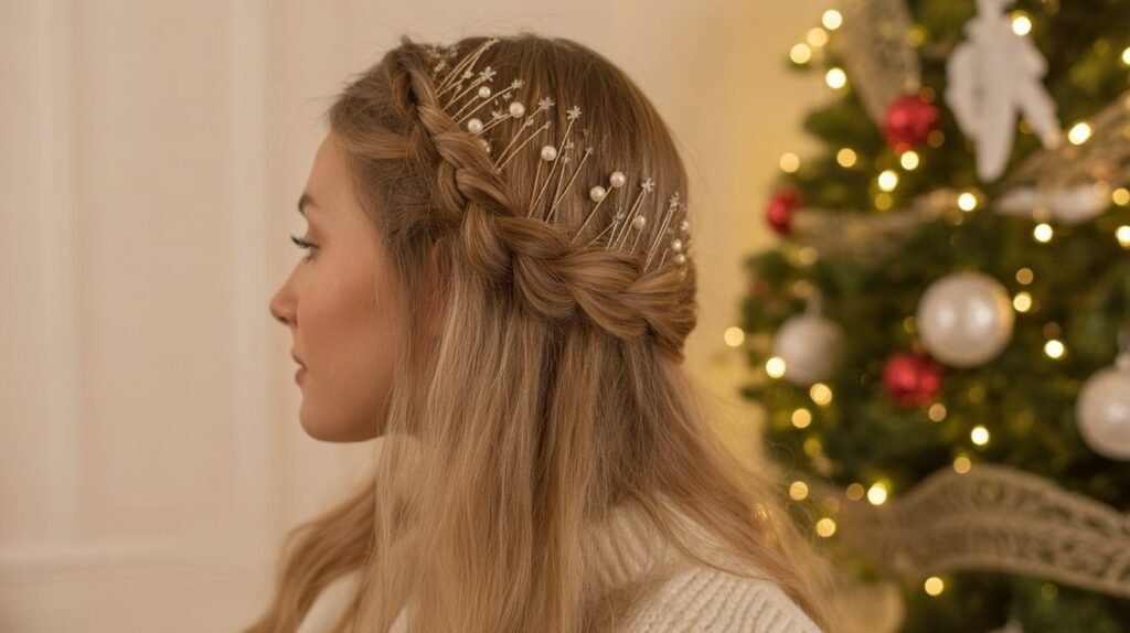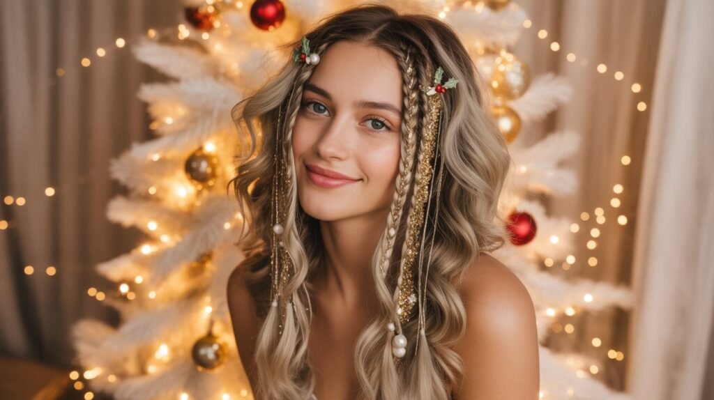 This style works well for medium to long hair and is perfect for Christmas gatherings, New Year’s Eve celebrations, or holiday photos. Its modern twist adds glamour while keeping the hairstyle practical and stylish.