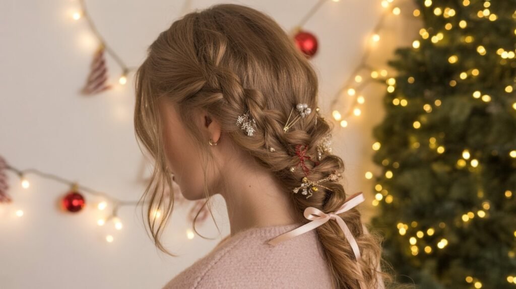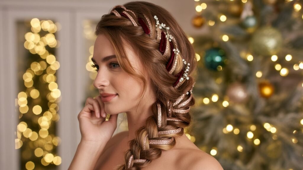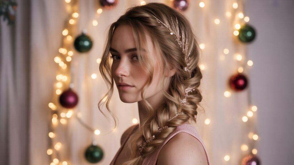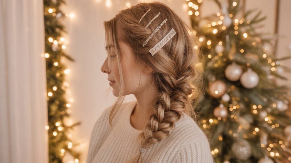 The side-swept braid is perfect for a casual yet festive look. Pull your hair over one shoulder and braid loosely, adding sparkly clips, small ribbons, or metallic thread to give it a holiday touch.