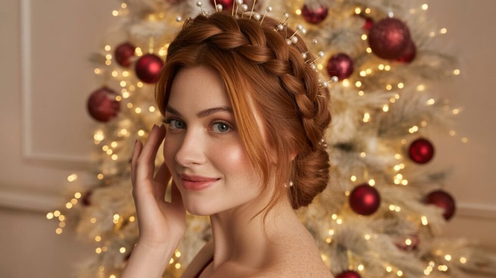 The braided crown is a stunning updo that wraps around your head like a halo, giving you a regal, festive look. Perfect for Christmas dinners, office parties, or holiday photos, this style can be enhanced with pearl pins, tiny ornaments, or glittery accents for that extra sparkle.