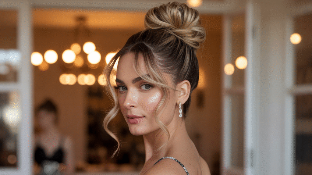 Pull hair into a high ponytail, twist it into a bun, and secure with pins. Leave a few strands loose around the face and lightly tease the crown for added volume. Finish with hairspray for hold and shine.