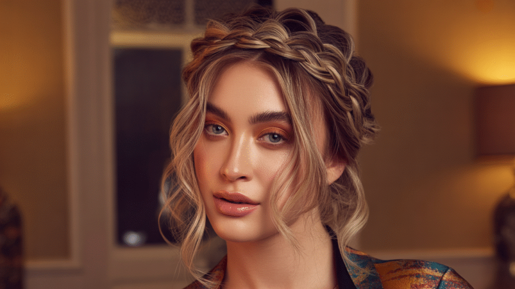 The messy braided crown is a stylish and whimsical hairstyle that instantly elevates any party look. Perfect for medium to long hair, it involves braiding sections along the front or sides of the head and securing them around the crown, creating a halo effect. The slightly undone, relaxed texture adds a playful yet elegant vibe, making it suitable for weddings, birthday parties, or festive evenings.