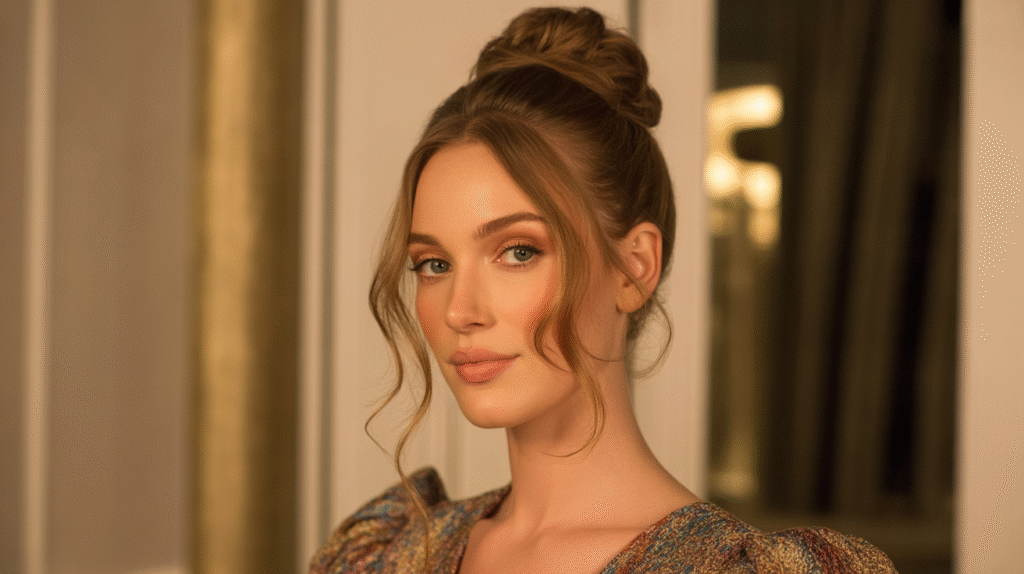 Perfect for formal events, cocktail parties, or weddings, the high bun keeps hair off the shoulders while maintaining style and elegance. The loose tendrils soften the face, creating a flattering and romantic effect. Optional accessories like sparkling pins, hair cuffs, or delicate combs can enhance the glamour, making this a truly show-stopping hairstyle that feels luxurious yet achievable.