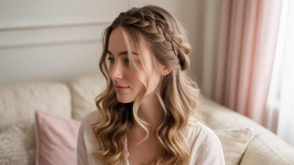 For a hairstyle that looks intentional without much effort, try a braided side twist. Take a small section of hair from one side, braid it loosely, and pin it back or incorporate it into a half-up style. This adds subtle detail while keeping your hair out of your face.