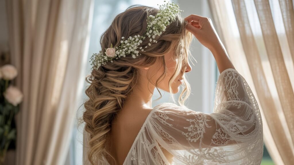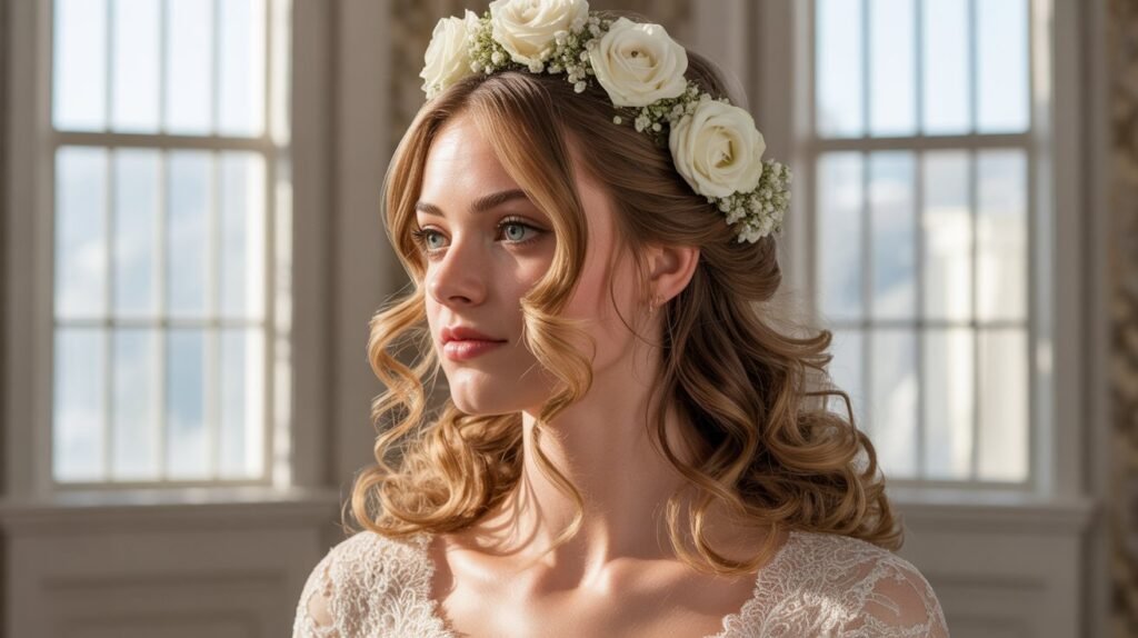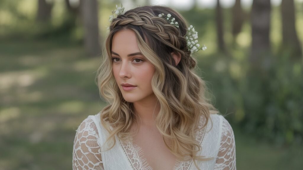 The braided crown is a romantic and regal hairstyle that wraps around the head like a halo, giving brides a fairytale-like appearance. This style works beautifully with long or medium-length hair and can be combined with curls or waves for added softness. It’s perfect for outdoor, garden, or bohemian-style weddings while remaining a classic choice that transcends trends.