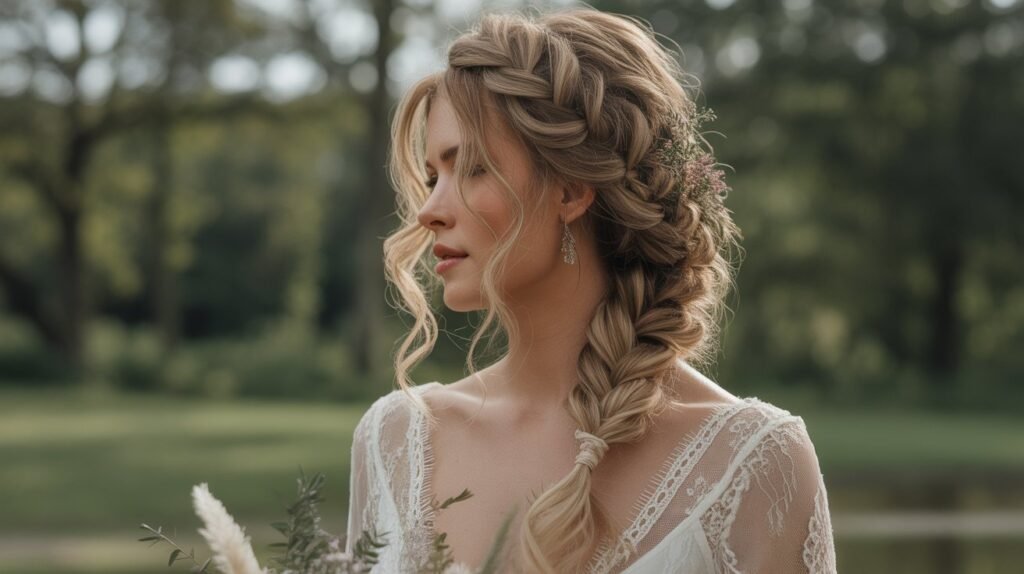 You can accessorize the braid with small flowers, greenery, or delicate pins to match your wedding theme. This hairstyle keeps hair controlled while maintaining a soft, flowing appearance. Its versatility and classic beauty ensure that it remains a beloved choice for brides seeking a timeless and whimsical look.