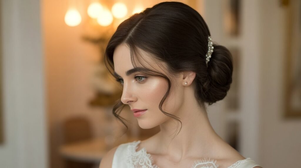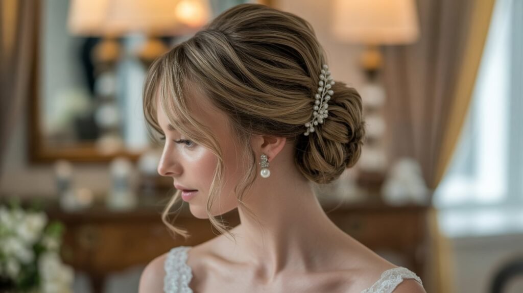 Adding delicate accessories like small flowers, pearls, or jeweled pins can enhance the romantic vibe, making this updo perfect for both traditional and contemporary weddings. It’s a versatile hairstyle that keeps hair neatly in place while allowing for softness around the face, achieving a classic yet dreamy bridal look.