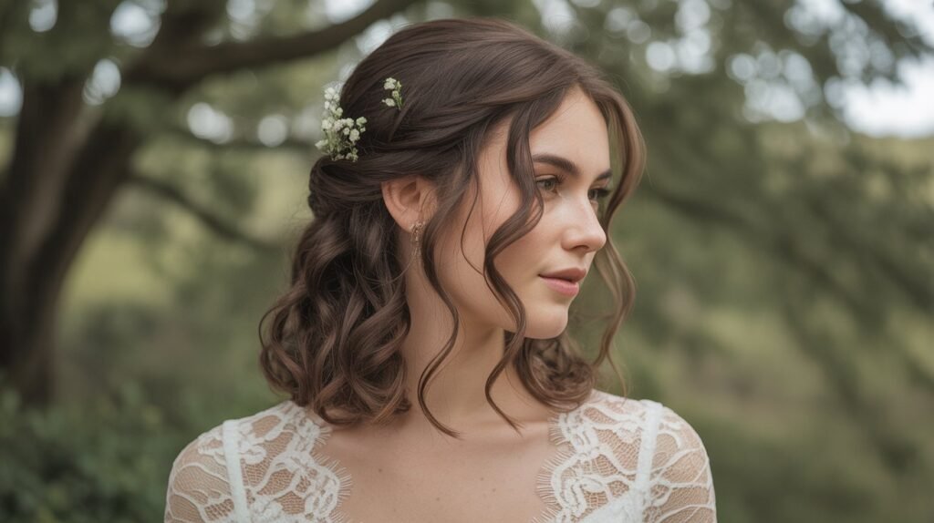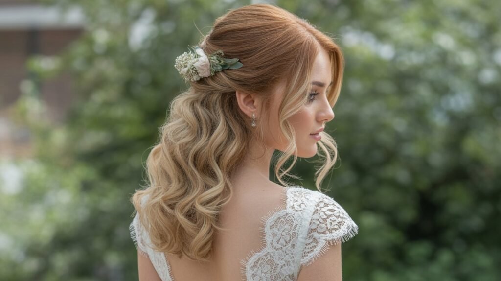 The half-up half-down hairstyle strikes the perfect balance between elegance and romance. By pulling back the top section of the hair while leaving the rest flowing freely, it frames the face beautifully and adds a soft, feminine touch. This style is incredibly versatile, working well with curls, waves, or straight hair, and it complements almost any wedding dress silhouette.