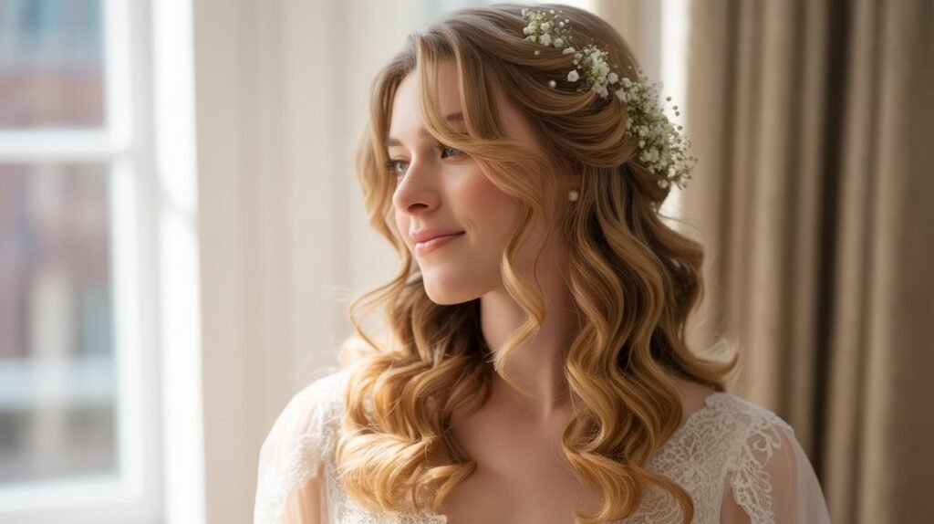 You can personalize this hairstyle by adding a side braid, small floral accents, or a delicate hair vine. It’s ideal for brides who want a relaxed yet polished look, maintaining elegance without feeling overly structured. The waves create a romantic aura that’s flattering for all face shapes and adds a touch of classic glamour.
