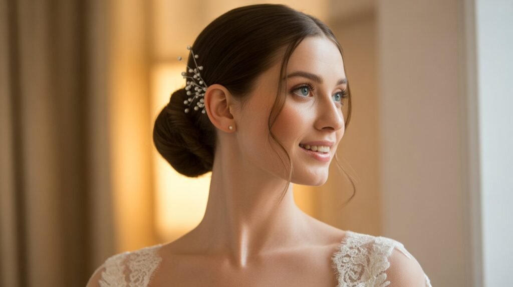 This hairstyle can be styled tight and polished for a refined look or slightly loose with tendrils for a softer, romantic effect. Its simplicity ensures that it complements rather than competes with your dress and accessories, making it a timeless bridal favorite.