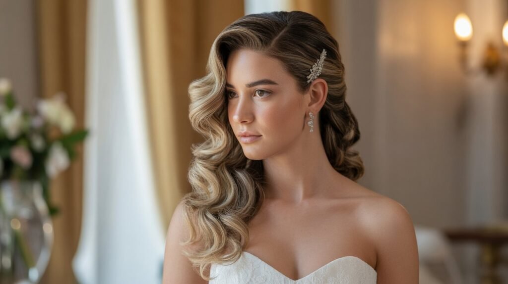 This style allows for versatility with accessories—delicate pins, small flowers, or a sparkling hairpiece can be added for a personalized touch. Soft side-swept curls combine classic glamour with a modern twist, making them a favorite for brides seeking a timeless yet effortless look.
