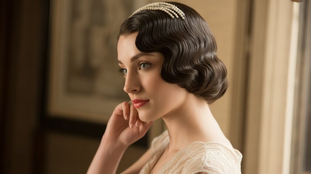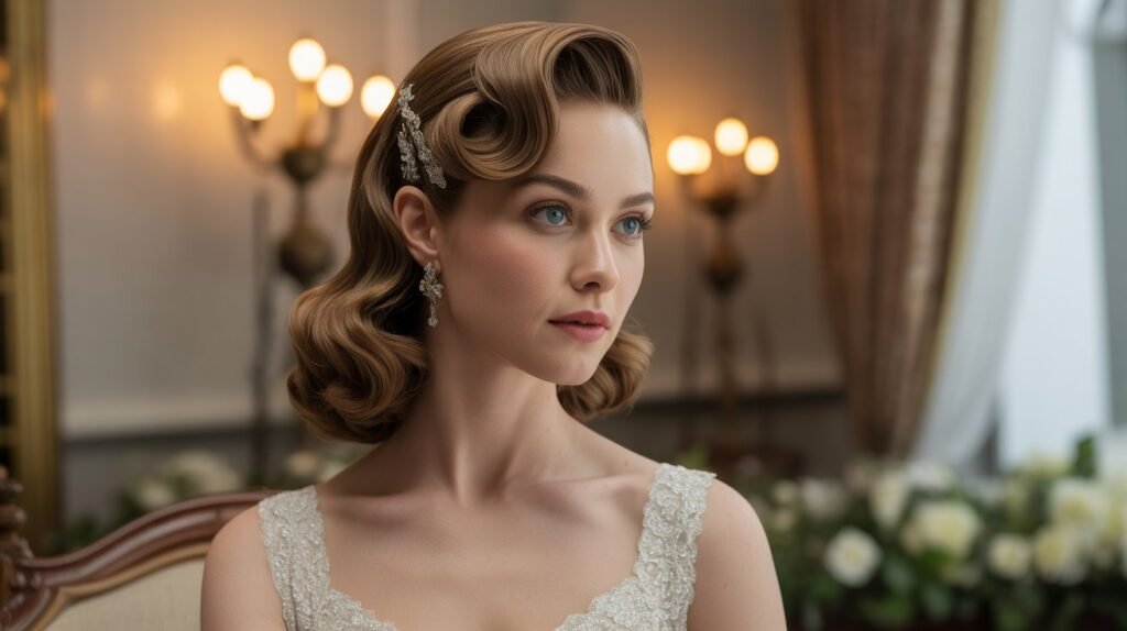 Vintage finger waves bring a touch of old Hollywood glamour to your bridal look. This sleek, structured hairstyle features defined waves that hug the head, creating a polished and elegant appearance. It’s perfect for brides who love retro style and want a hairstyle that stands out while remaining timeless. Finger waves pair beautifully with statement earrings or a vintage-inspired veil.
