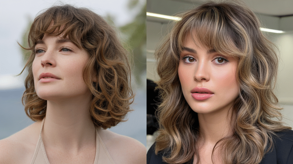 What makes this hairstyle so popular is its versatility and low-maintenance appeal. Curtain bangs grow out gracefully and blend seamlessly into wavy layers, making them ideal for everyday wear. Whether styled casually or slightly polished, this look fits perfectly into the soft, natural aesthetic defining wavy hair trends 2025. It’s trendy without trying too hard—exactly the vibe everyone’s going for right now.
