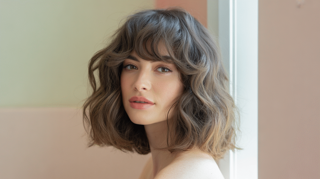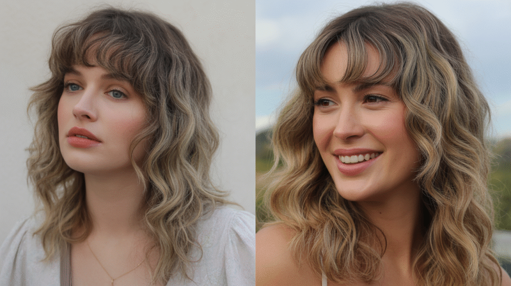 What makes this look truly “on point” is its versatility. Soft waves with wispy bangs feel polished enough for events yet relaxed enough for everyday wear. Using lightweight curl creams, volumizing sprays, and frizz-control serums helps define the waves while keeping the bangs soft and natural. This hairstyle perfectly captures the shift toward natural, low-effort beauty that defines wavy hair trends 2025, making it a go-to choice for women who want stylish hair without heavy styling.